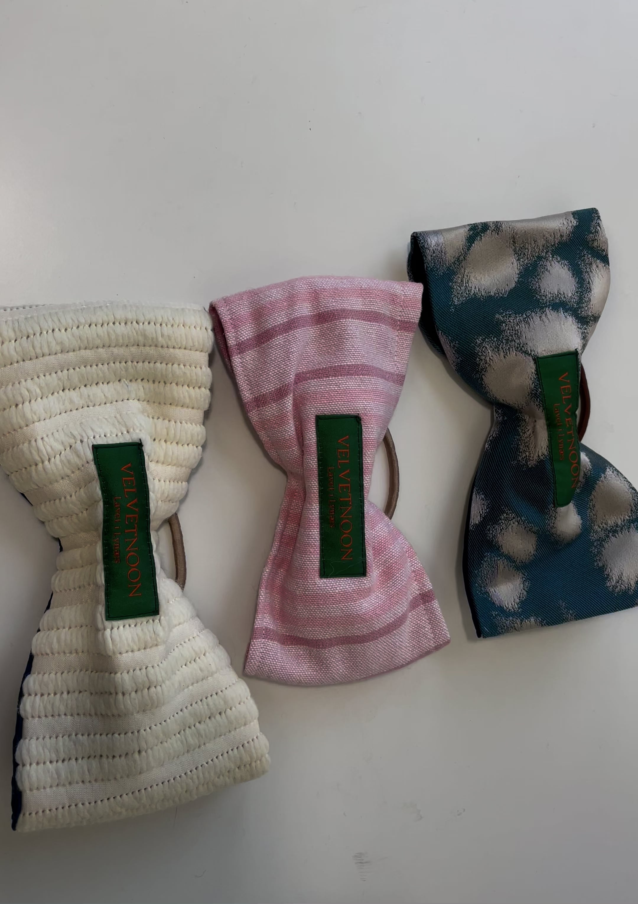 Velvetnoon´s 3 Bow Bundle er den perfekte måde at tilføje et strejf af klimavenlig elegance til din hverdag. Sættet indeholder tre unikke hårelastikker, hver lavet af smukke, upcyclede tekstiler, der giver nyt liv til materialer med historie og sjæl.